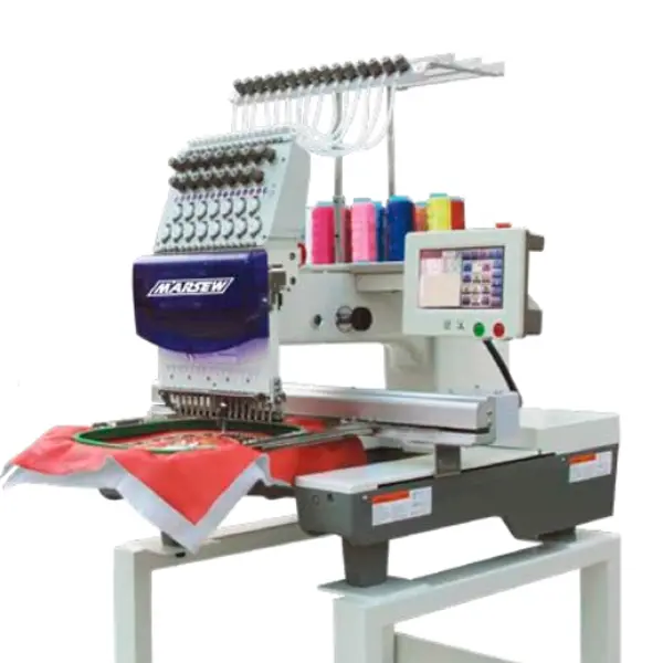Bordadora industrial MARSEW MR-1201 MT, una máquina de bordar plana con cilindro tubular estrecho para poder bordar botas, bolsillos, etc, sin brazos laterales, que nos permite bordar materiales más voluminosos.